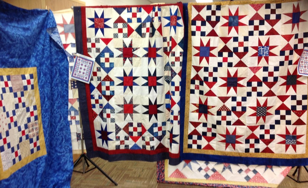 Mini-quilt show of our Tops. Blue with center panel is a Back. One of our group members likes interesting backs!