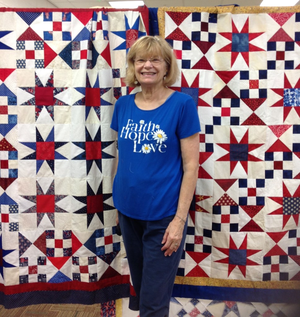 A lot can happen in a month. Our local QOV group–Stars and Stripes came up with three designs. The first two are just pictures as they use the 10-20-20 blocks you have made. The third design is on point. Directions and pictures shown here.