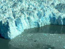 In flows into Prince William Sound, the columbia Glacier is one of the largest tidewater glaciers. This is an aerial view showing how irregular the face of the glacier is. Notice the calved icebergs and the blue color of the glacier. It is blue because glacial ice is not formed by freezing water but by compacting snow. The pressure drives out the air and makes a denser ice. The blue light from the sun’s solar spectrum reflects off this ice.