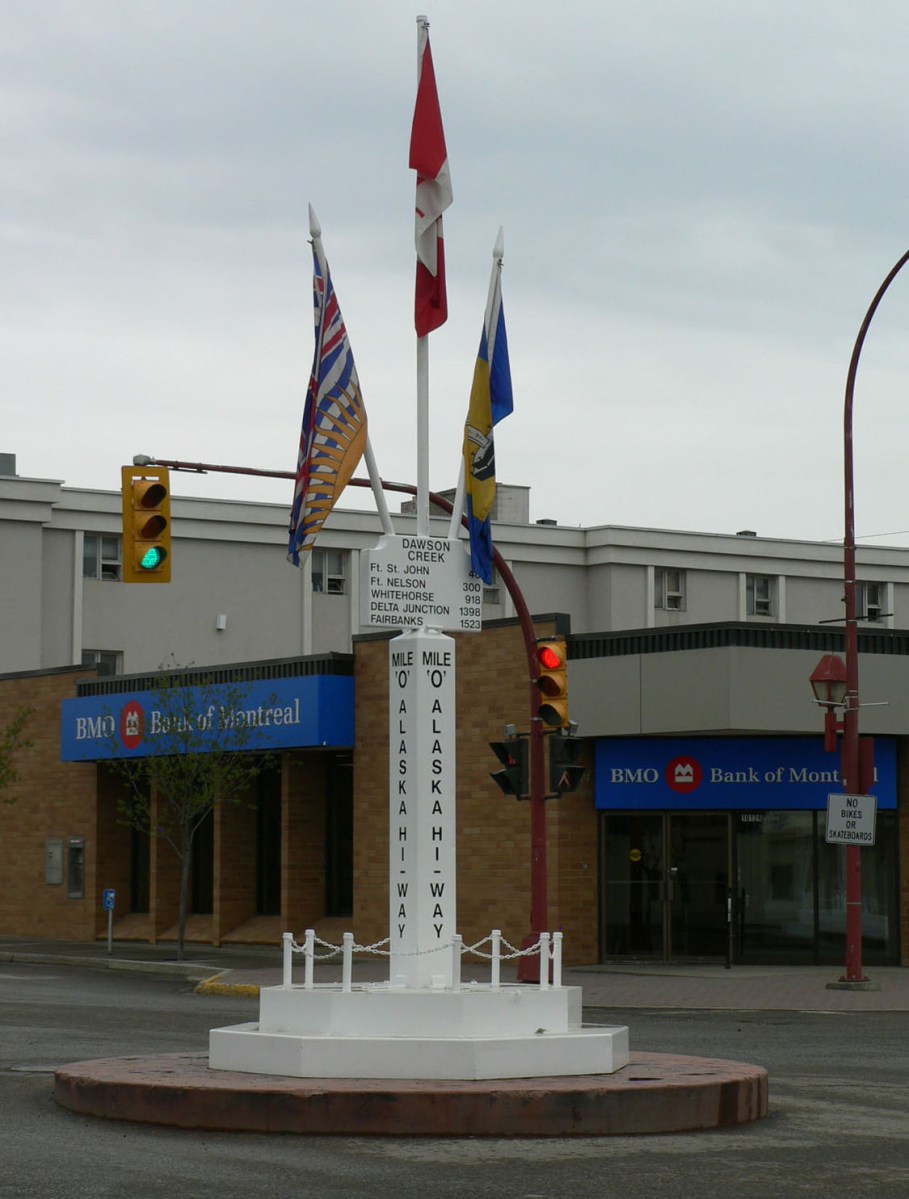 Dawson Creek, Canada August 4, 2014 by harrisrl1998 Leave a comment Mile “0” of the Alaska Highway in Dawson Creek, British Columbia. The monument is in the middle of the intersection. After Pearl Harbor, this road to Alaska was built in one year by the Army.