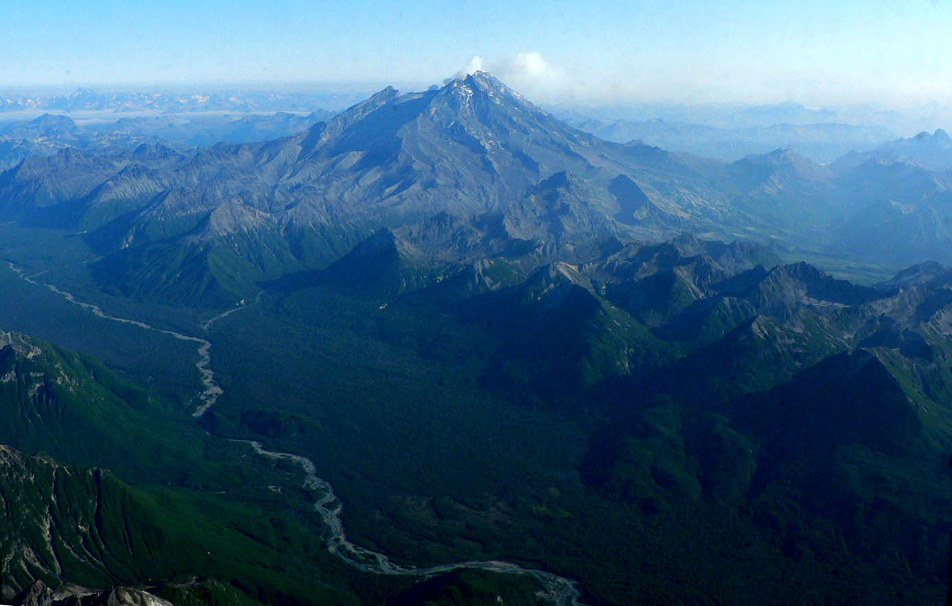 Reboubt had a major eruption in 1990. It shut down Anchorage air traffic. Then it erupted again in April 2009, a month before our visit, and was still erupting when we flew by it in June. It is 10,197 feet high. There is very little snow because it is hot underneath.