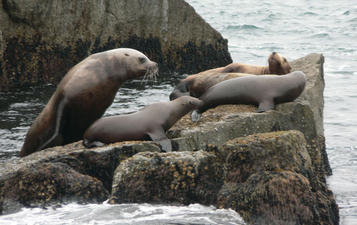 Stellar sea lions Kenai fjords August 4, 2014 by harrisrl1998 Leave a comment Stellar sea lion’s resting on rocks in the Kenai Fjords National Park. The bull male on the left is much larger than the females and pups. These sea lions are much bigger than the ones you see in California.